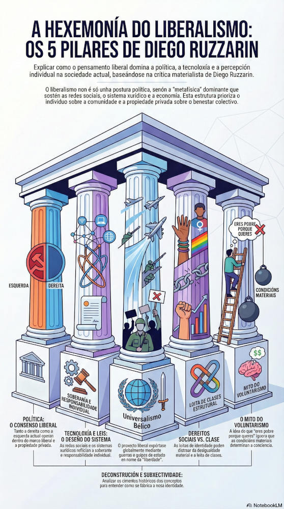 Este informe somete a exame as estruturas de poder e as premisas ideolóxicas do liberalismo contemporáneo baixo a lente da dialéctica materialista. A través das teses de xente como Diego Ruzzarin, desmóntanse as concepcións naturalizadas do sistema vixente, revelando a súa esencia como un proxecto metafísico que supón a primacía do capital sobre a vida social.